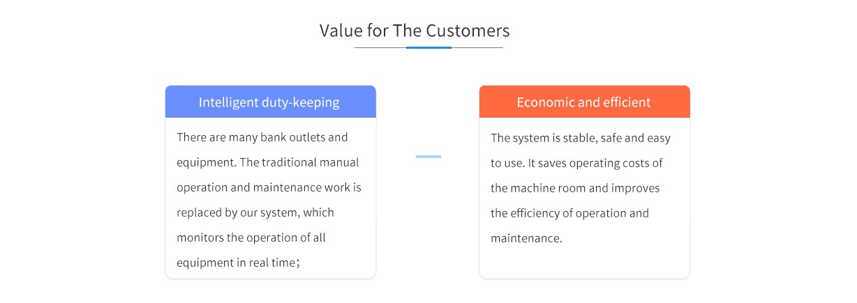 Intelligent duty-keeping:There are many bank outlets and equipment. The traditional manual operation and maintenance work is replaced by our system, which monitors the operation of all equipment in real time;